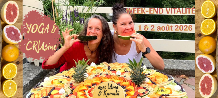 Le stage démarrera le samedi 1 août à 9h et se terminera le dimanche 2 août vers 18h30. Matin et soir, Uma vous guidera dans une pratique de yoga somatique accessible à toutes et tous, sans pré-requis. Elle proposera également de petits temps de méditation, tandis que Kamalā s’occupera de nous régaler grâce à ses ateliers de CRU-sine en fin de matinée pour préparer le brunch et dans l’après-midi pour découvrir de nouvelles recettes.